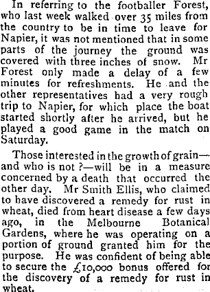 In referring to the footballer Forest, who last week walked over 35 miles from the country to be in time to leave for Napier, it was not mentioned that in some parts of the journey the ground was covered with three inches of snow. Mr Forest only made a delay of a few minutes for refreshments. He and the other representatives had a very rough trip to Napier, for which place the boat started shortly after he arrived, but he played a good game in the match on Saturday. Those interested in the growth of grain—and who is not ?—will be in a measure concerned by a death that occurred the other day. Mr Smith Ellis, who claimed to have discovered a remedy for rust in wheat, died from heart disease a few days ago, in the Melbourne Botanical Gardens, where he was operating on a portion of ground granted him for the purpose. He was confident of being able to secure the ,£lO,OOO bonus offered for the discovery of a remedy for rust in wheat.