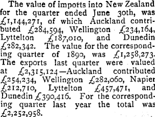 The value of imports into New Zealand for the quarter ended June 30th, was £1,144,271, of which Auckland contributed £284,594, Wellington £234,164, Lyttelton £187,010, and Dunedin £282,342. The value for the corresponding quarter of 1890, was £1,258,273. The exports last quarter were valued at £2,3ls,l24—Auckland contributed £254,234, Wellington £282,060, Napier £212,710, Lyttelton £457,471, and Dunedin £390,416. For the corresponding quarter last vear the total was £2,252,958.