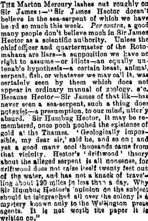 TitK Marton Mercury lashes out roughly on Sir James:—"Sir James Hector doesn’t believe in the sea-serpent of which we have he -rd so much this week. Per contra, a good many people don’t believe much in Sir James Hector as a scientific authority. Unless the chief ofljoer and quartermaster of the Rotomahana are liars—a supposition we have no right to assume—or idiots—an equally untenable hypothesis—a certain beast, animal, serpent, fish, or whatever we mayoa’l it, was certainly seen by them which does not appear in ordinary manual of zoology, e‘o. Because Hector—Sir James of that ilk—has never seen a sea-serpent, such a thing does pqtexisj—a presumption, to our mind, utter'y absurd! Sir Humbug Hector, it may be remembered, once pooh poohed the existence of gold a'- the Thames. 1 Geologically impossible, my dear sir,’ said he, sod so on ; and yet a good tnanv cool thousands came from that vicinity. Hector's ‘ driftwood ’ theory about the alleged serpent is all nonsense, for driftwood does not raise i'eelf twenty feet out of tbe water, and has not a knack of travs'ling about 120 miles Jn loss than a day. Why Sir Humbug IJeotor’e opinion on tfie subject should be telegraphed ah over ths colony i» a mystery known only to ths Wa'Kngton press agents. It h tiut worth tqe paper it >'e written on,"