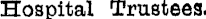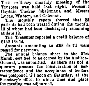 The ordinary monthly meeting of tho Trustees was held last night, Present 1 Captain Tucker (chairman), and Messrs Lucas, Watson, and Coleman. The monthly report showed that 23 patients had been treated dating the month, 13 ot whom had been discharged ; remaining at date 12. The Treasurer reported a credit balance of £132 18s sd. Accounts amounting to £9B Gs 7d were passed for payment. The anneal balance sheet to the 31st March, certified to as correct by the AuditorGeneral, was submitted. As there was not a quorum present the consideration ot oor* respondence and the acceptance of tenders was postponed till noon on Saturday, at the Secretary’s office, to which time and plaoe the meeting was adjourned.