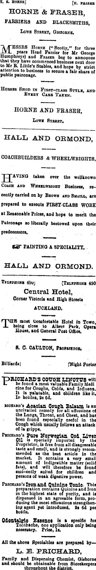 T. S. HOBNEj [ Hi F B 4g ER HORNE & FRASEB, FARRIERS AND BLACKSMITHS, Lowe Street, Gisborne. MESSRS Horne (“Scotty,” for three years Head Farrier for Mr George Humphreys) and Fraser beg to announce that they have commenced business next door to Mr .R. Little’s Stables, and hope by strict attention to business to secure a fair share of public patronage. Horses Shod in First-class Style, and Every Care Taken. HORNE AND FRASER, Lowe Street* HALL AND ORMOND, COAOHBUILDERS & WHEELWRIGHTS, ~jq~AVING taken over the wellknown Coach and Whbbiwbight Business, recently carried on by Brown and Smaild, are prepared to execute FIRST CLASS WORK at Reasonable Prices, and hope to merit the Patronage so liberally bestowed upon their predecessors. B®' PAINTING A SPECIALITY. HALL AND ORMOND. TstarHONH 49uj [Telffhonx 490 Central Hotel, Corner Victoria and High Streets AUCKLAND, THE most Comfortable Hotel in Town, being close to Albert Park, Opera House, and General Post Office, B. 0. OAVLTON, Pbomhstoh, Billiards i fNight Porter "PRICHARD'S COUGH LINCTUS will L be found a most valuable Family Medi cine for Coughs, Colds, and Influenz. It is palatable, and children like it. In bottles, 2s 6d. BtcHAßD's Acaelan Cough. Salaam >s an unrivalled remedy for all affections of the Lungs, Throat, and Chest, and has been found especially useful in the Cough which usually follows an attack of la grippe. Pbiohabd’s Pur* Norwegian Cod Liver Oil is specially imported by the Proprietor, ia free from all disagreeable taste and smell, and is strongly recommended as the best article in the market. It contains a very small amount of indigestible matter (solid fats), and will therefore ba found eminently suited for children and persons of weak digestive power. Pbiohabd’s Iron and Quinine Tonic- This preparation contains Quinine and Iron in the highest state of purity, and is dispensed in an agreeable form, producing the most efficacious strengthening agent yet introduced. 2s 6d per bottle. Odontalgic Essence is a specific tor Toothache, one application only being necessary. Price, Is, All the above Specialties are prepared by— L. E. PRICHARD, Family and Dispensing Chemist, Gisborne and should be obtainable from Storekeepers throughout the district.