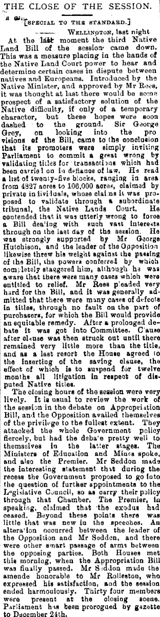 THE CLOSE OF THE SESSION. a IL.';- ~. [SFECIAL TO THIS STANDABD.J . —— Wellington, last night At the Idit moment the third Native Land Bill of the session- came down. This was a measure placing in the hands of the Native Land Court power to hear and determine certain cases in dispute between natives and Europeans. Introduced by the Native Minister, and approved by Mr Bees, it was thought at last there would be some prospect of a satisfactory solution of the Native difficulty, if only of a temporary character, but these hopes were soon dashed to tho ground. Sir George Grey, on looking into the pro visions of the Bill, cams to tha conclusion that its promoters were simply inviting Parliament to commit a great wrong by validating titles for transactions which had been earriel on in defiance of law. He read a list of twenty-five blocks, ranging ia area from 4827 acres to 106,000 acres, claimed by private in iiviluats, whose clains it was proposed to validate through a subordinate tribunal, the Native Lands Court. He contended that it was utterly wrong to force a Bill dealing with such vast interests through on the last day of the session. He was strongly supported by Mr George Hutchison, and the leader of the Opposition likewise threw bis weight against the passing of tha Bill, ths powers oonterra-i by which | completely staggered him, although ho was aware that there were many oases which were sntitled to relief. Mr Rees pleaded very hard for tha Bill, and it was generally admitted that there were many cases of defects in titles, through no fault on the part of purchasers, for which the Bill would provide an equitable remedy. After a prolonged debate it was got into Committee. C ause after clause was then struck out until there remained very little more than the title, and as a last resort the House agreed io the inserting of the saving clause, the effect of which is to suspend for twelve months all litigation in respect of disputed Native titles. The closing hours of the session were very lively. It is usual to review the work of the session in the debate on Appropriation Bill, and the Opposition availed themselves of the privilege to the fullest extent. They attacked the whole Government policy fiercely, but had the deba'e pretty well to themselves in the latter stages. The Ministers of Education and Miass spoke, and also the Premier. Mr Seddou made the interesting statement that during the recess the Government proposed to go into the question of further appointments to the Legislative Council, so as carry their policy through that Chamber. The Premier, ia speaking, claimed that the exodus had ceased. Beyond these points there was little that was new in the speeches. An altera'ion occurred between the leader of the Opposition and Mr Seddcn, and there were other smart passage of arms between the opposing parties. Both Houses met this morning, when the Appropriation Bill was finally passed. Mr Siddon made the amende honorable to Mr Rolleston, who expressed his satisfaction, and the session ended harmoniously. Thirty four members were present at the closing scene. Parliament has been prorogued by gazette to December 24th.