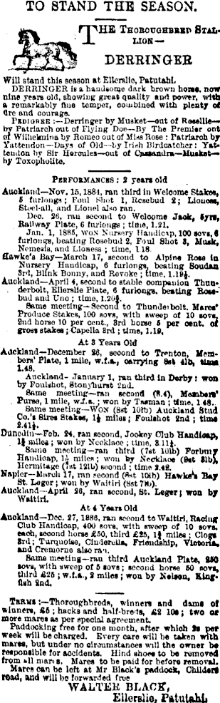 TO STAND THE SEASON. f | ’'HE Thobouuhbbbp Sial- — _L ijon— DERRINGER Will stand this season at Ellerslie, Patutahi. DERRINGER is a handsome dark brown horse, now nine years old, showing great quality and power, with a remarkably fine temper, oom blued with plenty of fire and courage. Pkdigree Derringer by Musket—out of Rosellie—by Patriarch out of Flying Doe—By The Premier ont of Wilhelmina by Romeo out of Miss Rose : Patriarch by Yattendon—Days of Old—-by Irish Birdcatcher: Yattendon by Sir Hercules—out of Cassandra—Musket—by Toxopholito. Performances : 2 years old Auckland—Nov. 16,1881, ran third in Welcome Stakes, 5 furlongs; Foul Shot 1, Rosebud 2; Lioness, Steel-all, and Lionel also ran. Dec. 26, ran second to Welcome Jaok, iyrs, Railway Plate, 6 furlongs ; time, 1.21. Jan. 1, 1885, won Nursery Handicap, 100 sovs, 6 furlongs, beating Rosebud 2, Foul Shot 8, Musk, Nemesis, and Lioness ; time, 1.18. Hawke's Bay—March 17, second to Alpine Rose in Nursery Handicap, 6 furlongs, beating Soudan 3rd, Blink Bonny, and Revoke ; time, Auckland—April 4, second to stable companion Thun* derbolt, Ellerslie Plate, 6 furlongs, beating Rosebud and Uno ; time, 1.201. Same meeting—Second to Thun det bolt. Maros* Produce Stakes, 100 aovs, with sweep of 10 sovs, 2nd horse 10 per cent., Brd horse 5 per cent, of gross stakes; Capella 3rd ; time, 1.10, At 3 Years Old Auckland-December 26, second to Trenton, Members’ Plato, 1 mile, w.f.a., carrying Set 41b, time Auckland- January 1, ran third In Darby: won by Foulshot, Stonyhurst 2nd. Same meeting—ran second (8.4), Members’ Purse, 1 mile, wJ.a.; won by Taeman ; time. 148. Same meeting—Won (Brt 10lb) Auckland Stud Co.’s Sires Stakes, miles; Foulshot 2nd ; time Dunodin—Fob. 24, ran second, Jookoy Club Handicap, If miles ; won by Necklace ; time, B.llf. Sarno meeting—ran third (7st 101 b) Forbuiy Handicap, li miles; won by Necklace (Ost 81b), Hermitage (“st 121 b) second ; time 2.42. Napier—March 17, run second (Ost 101 b) Hawke's Bay St. Legor; won by Waitlrl (Bst 7Mj). Auckland—April 26, ran second, St. Lcgcr; won by At 4 Years Old Auckland—Dec. 27,1886, ran second to Waitiri, Racing Club Handicap, 400 sovs. with sweep of 10 sovs. each, second horse £5O, third £25, 1» miles ; Clogs Brd; Turquoise, Cinderella, Friendship, Victoria, and Cremorne also ran. Sarno meeting—ran third Auckland Plate, 250 sovs, with sweep of 5 sovs ; second horae 50 sovs, third £25 ; w.t.a., 2 miles ; won by Nelson, Kingfish 2nd. Terms ’.—Thoroughbreds, winners and dams of winners, £5 ; hacks and half-breds, £2 108 ; two or more mares as per special agreement. Paddocking free for one month, after which 2s per week will be charged. Every care w ill be taken with mares, but under no circumstances will the owner bo responsible for accidents. Hind shoes to be removed from i»ll man s. Mares to be paid for before removal. Marcs can be left at Mr Black’s paddock, Childert road, ftnd will bp forwarded free WALTER BLACK, Eilerelio, PitulahL