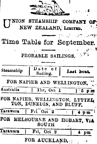 FTNION STEAMSHIP COMPANY OF NEW ZEALAND, Limited. Time Table for September. PROBABLE SAILINGS. Steamship [ ’ j *»»». FOB NAPIER AND WELLINGTON. Australia Ihr, O<Ul | '5 pm fob napier. Wellington, lyttel TON, DUNEDIN, AND BLUFF. Taraweta |~ Fii.' Oct 2 | 4pm FOB MELBOURNE AND HOBABT, VIA SOUTH Tarawera | Fri, Oct' 2 | 4 pm FOR AUCKLAND.