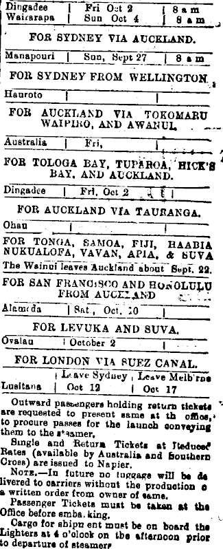 Dingadee [ Fri O;t 2 | Bam Wauarapa | Sun Oct 4 | 8a m FOR SYDNEY VIA AUCKLAND. Manapouri | Sun. Hept 27 | Bam FOR SYDNEY FROM WELLINGTON Hauroto | - j - FOR AUCKLAND VIA TOKOMARU WAIPIRO, AND AWANUL Australia Fri, U FOB TOLOGA BAY, TUPABOA, HICK’S BAY. AND AUCKLAND. Dingadee | Fri, Oct 2 ~.. ; | ' FOB AUCKLAND Vla TAURANGA. Ohau I j FOK TONGA, SAMOA, FIJI, HAABIA NUKUALOFA, VAVAN, APIA, SUVA The Wainui leaves Auckland about Sept. 22. FOB BAN FRANOiSCO AND HONOLULU FROM AUCKLAND Alam.-da ~ | Sat~ Oct. 10 j FOR LEVUKA AND SUVA. Ovalau October 2 j FOR LONDON VIA SUEZ CANAL. I L ave Sydney , Leave Melb rni Lueitana | Oct 12 | Q ot 17 Outward passengers holding return ticket, are requested to present same at th office to procure passes for the launch conveyina them to the 8* earner, * Single and Return Tickets at Reduced Rates (available by Australia and Southern Gross) are issued to Napier. Note.—ln future no luggaee will be de livered to carriers without the production o a written order from owner of same. Passenger Tickets must be taken at the Office before emba. king. Cargo for shipn ent must be on board th. Lighters at 4 o’clock on tbe afternoon prior to departure of steamer?