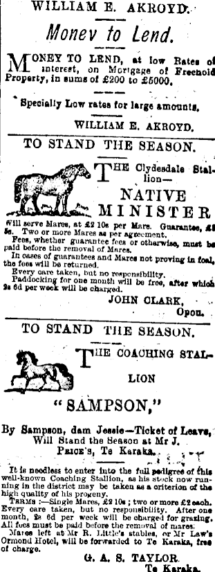 WILLIAM E. AKROYD. Money Jo Lend. MONEY TO LEND, at low Rates ot interest, on Mortgage of Freehold Property, in sums of £2OO to £5OOO, Specially Low rates for large amount., WILLIAM E. AKROYD. TO STAND fHEIiEABON: r T , HE Clydesdale Stal--L lion—native MINISTER Will serve Mares, at £2 10b per Mare. Guarantee £8 fa- Two or more Mares m per agreement. ’ f?%/ rhe Jt her f, 'e* or otherwise, must be paid before the removal of Mares. In oases of guarantees and Mares not proving in foaL the fees will be returned. ’ Every care taken, but no responsibility. Paddocking for one month will bo free, after which 2s 6d per week will be charged. ’ JOHN CLARK, Opon. TO STAND THE SEASON. _ *pilE COACHING STALlion “ SAMPSON,” By Sampson, dam Jessie—Ticket of Le&va, Will Stand the Season at Mr J. Price's, Te Kuraka. It is neediest to enter into the full pedigree of this well-known Coaching Stallion, as his stock now running in the district may be taken as a criterion of the high quality of his progeny. Terms :—Single Mares, £2 10s ; two or more £2 each. Every care taken, but no responsibility. After one month, 2s (id per week will be charged for grazing. All fees must be paid before the removal of mares. Mares left at Mr R. Little’s stables, nr Mr Law’s Ormond Hotel, will be forwarded to Te Karaka, free of charge. G. A. S. TAYLOR Te Karaka.