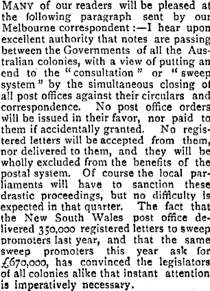 Many of our readers will be pleased at the following paragraph sent by our Melbourne correspondent : —I hear upon excellent authority that notes are passing between the Governments of all the Australian colonies, with a view of putting an end to’ the “consultation” or “sweep system ” by the simultaneous closing of all post offices against their circulars and correspondence. No post office orders will be issued in their favor, nor paid to them if accidentally granted. No registered letters will be accepted from them, nor delivered to them, and they will be wholly excluded from the benefits of the postal system. Of course the local parliaments will have to sanction these drastic proceedings, but no difficulty is expected in that quarter. The fact that the New South Wales post office delivered 350,000 registered letters to sweep promoters last year, and that the same sweep promoters this year ask for /670,00 c has convinced the legislators of all colonies alike that instant attention is imperatively necessary.