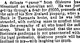 A delicate “pansy’’ from Gisborne has blossomed on Australian soil. He was just getting through a draft for proceeds of the sale of hia New island property, when a Bank in Tasmania broke, and he was left stranded, with nothing more to comfort him than the sympathy of all who heard the sad story, v/lien ft is mentioned that the unfortunate gentleman is not unconnected with the legal profession, Gisborne people will be inclined to laughing too nigoll-