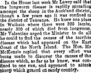 In the House last week Mr Lawry said that the lungworm disease is rapidly spreading amongst the sheep in the Auckland district, though a few years ago it was confined to the district of Tauranga. Ha knew one place in Waikato where there were 820 lambs, nearly 300 of which died from lungworm. Mr Valentine urged the Minister to do all he could to find the causes of the terrible disease which had appeared on the East Coast of the North Island. The Hon. Mr McKenzie replied that every eSort was being made to discover the causes of the disease which, so far as he knew, was confined to one tun, and appeared to attack Sheep which grazed oil sandy country.