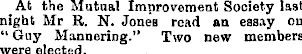 At the Mutual Improvement Society last night Mr R. N. Jones read an essay on “ Guy Mannering.” Two new members were elected.