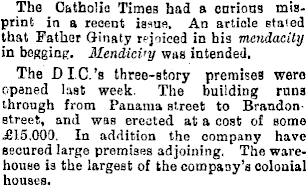 The Catholic Times had a curious misprint in a recent issue. An article stated that Father Ginaty rejoiced in his mendacity in bogging. Mendici'y was intended. The DlC.’s three-story premises were opened last week The building runs through from Panama street to Brandonstreet, and was erected at a cost of some £15.000. In addition the company have secured large premises adjoining. The warehouse is the largest of the company’s colonial houses.