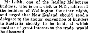 Mr Leith, one of the leading Melbourne builders, who is on a visit to N.Z , addresed the builders of Wellington the other night, and urged that New Zealand should send a delegate to the annual convention of builders in Australia shortly to be held, at which matters of great interest to the trade would be discussed.