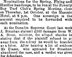 Nominations for the Spring, Flying and Hurdles handicaps, to be run at the Poverty Bay Turf Club’s Spring Meeting, close on Thursday, Ist October, at the Masonic Hotel, at 8 p.m. One sovereign is the amount required to be forwarded with each nomination. At the Dunedin Supreme Court last week J. Strachan claimed £3OO damages from W. A. Stout, solicitor, for alleged slander in stating that if the plaintiff refused to go away from the colony he would be branded as a felon. After hearing a lot of evidence Mr Eraser, who appeared for Strachan, abandoned the case, and a verdict was given for defendant.