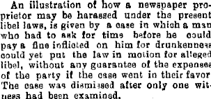An illustration of how a newspaper proprietor may be harassed under the present libel laws, is given by a case in which a man who had to ask for time before he could pay a flue inflicted on him for drunkenness could yet put the law in motion for alleged libel, without any guarantee of the expenses of the party if the case went in their favor. The case was dismissed after only one witness had been examined.