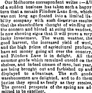 Our Melbourne correspondent writes All of a sudden business has taken such a happy turn that a certain Flinders Lane firm, which was not long ago floated into a limited liability company with such disastrous results that the shareholders thought of winding up the concern and hinted at suing the vendors, is now showing signa that it will prove a very lucky investment. The warm weather, the good harvest, the increased yield of wool, and the high prices of agricultural produce, have set money going all over the country, and Flinders Lane is in delight. All the summer goods which remained unsold on the shelves, and indeed unseen of men, last year, are being brought out and furbished up and displayed to advantage. The soft goods warehousemen are delighted, and to do them justice they spend as freely as they receive, The general prospects of the spring are ad mltted to be excellent.