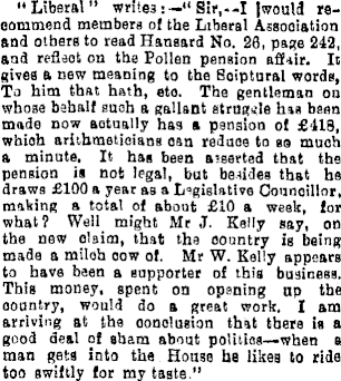 “Liberal" writesSir,--I [would recommend members of the Liberal Association and others to read Hansard No. 26, page 242, and reflect on the Pollen pension affair. It gives a new meaning to the Soiptnral words, To him that hath, etc. The gentleman on whose behalf such a gallant struggle has been made now actually has a pension of £4lB, which arithmeticians oan reduce to so much a minute. It has been averted that the pension is not legal, but besides that he draws £lOO a year as a Legislative Councillor, making a total of about £lO a week, for what? Well might Mr J. Kelly say, on the new claim, that the country is being made a miloh cow of. Mr W. Kelly appears to have been a supporter of this business. This money, spent on opening up the country, would do a great work. I am arriving at the conclusion that there is a good deal of sham about polities—when a man gets into the House he iikes to ride too swiftly for my taste.”