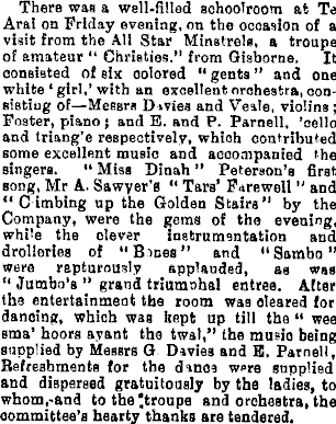 There was a well-filled schoolroom at Te Arai on Friday evening, on the occasion of a visit from the All Star Minstrels, a troupe of amateur “ Christies.” from Gisborne. It consisted of six colored “ gents ” and one white * girl,’ with an excellent orchestra, consisting of—Messrs D ivies and Veile, violins ; Foster, piano; and E. and P. Parnell, 'cello and triang'e respectively, which contributed some excellent music and accompanied the singers. “ Miss Dinah ” Peterson’s first song, Mr A. Sawyer’s “ Tars’ Farewell " and “ C imbing up the Golden Stairs" by the Company, were the gems of the evening, while the clever instrumentation and drolleries of "Bines” and "Sambo" were rapturously applauded, as was “ Jumbo’s ” grand triumohal entree. After the entertainment the room was cleared for dancing, which was kept up till the “ wee sma’ hoors ayant the twal," the music being supplied by Messrs G Davies and E. Parnell, Refreshments for the dance were supplied and dispersed gratuitously by the ladies, to whom,-and to the 'troupe and orchestra, the committee’s hearty thanks are tendered.