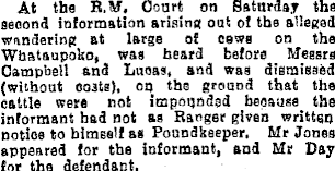At the R.M. Court on Saturday the second information arising oat of the alleged wandering at large of cows on the Wha’.anpoko, was heard before Messrs Campbell and Lucas, and was dismissed {without costs), on the ground that the cattle were not impounded because the informant had not as Ranger given written notice to himself as Poundkeeper, Mr Jones appeared for the informant, and Mr Day for the defendant,