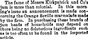 The fame of Messrs Kirkpatrick and Go’s jam is more than colonial, In this morning’s issue an announcement is made concerning the Orange Seville marmalade made by the firm. In purchasing these brands of jam heads of households may depend on there being no deleterious ingredients such as is too often to be found in the Imported article.