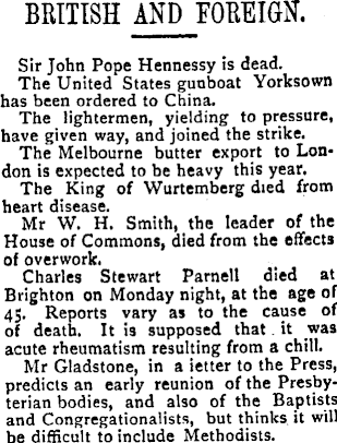 BRITISH AND FOREIGN. Sir John Pope Hennessy is dead. The United States gunboat Yorksown has been ordered to China. The lightermen, yielding to pressure, have given way, and joined the strike. The Melbourne butter export to London is expected to be heavy this year. The King of Wurtemberg died from heart disease. Mr W. H. Smith, the leader of the House of Commons, died from the effects of overwork. Charles Stewart Parnell died at Brighton on Monday night, at the age of 45. Reports vary as to the cause of of death. It is supposed that it was acute rheumatism resulting from a chill. Mr Gladstone, in a ietter to the Press, predicts an early reunion of the Presbyterian bodies, and also of the Baptists and Congregationalists, but thinks it will be difficult to include Methodists.
