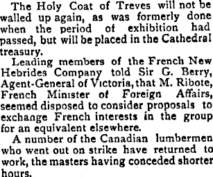 The Holy Coat of Treves will not be walled up again, as was formerly done when the period of exhibition had passed, but will be placed in the Cathedral treasury. Leading members of the French New Hebrides Company told Sir G. Berry, Agent-General of Victoria, that M. Ribote, French Minister of Foreign Affairs, seemed disposed to consider proposals to exchange French interests in the group for an equivalent elsewhere. A number of the Canadian lumbermen who went out on strike have returned to work, the masters having conceded shorter hours.