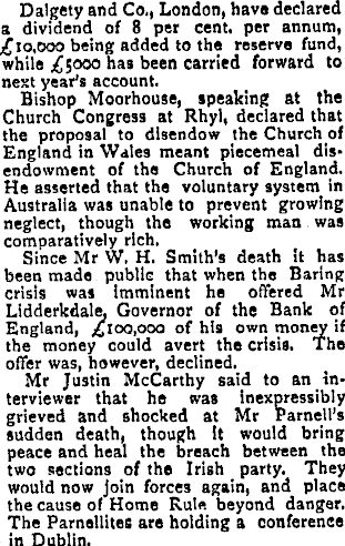 Dalgety and Co,, London, have declared a dividend of 8 per cent, per annum, £lO,OOO being added to the reserve fund, while £5OOO has been carried forward to next year’s account. Bishop Moorhouse, speaking at the Church Congress at Rhyl, declared that the proposal to disendow the Church of England in Wales meant piecemeal disendowment of the Church of England. He asserted that the voluntary system, in Australia was unable to prevent growing neglect, though the working man was comparatively rich. Since Mr W. H. Smith's death it has been made public that when the Baring crisis was imminent he offered Mr Lidderkdale, Governor of the Bank of England, £lOO,OOO of his own money if the money could avert the crisis. The offer was, however, declined. Mr Justin McCarthy said to an interviewer that he was inexpressibly grieved and shocked at Mr Parnell’s sudden death, though it would bring peace and heal the breach between the two sections of the Irish party. They would now join forces again, and place the cause of Home Rule beyond danger. The Parnellites are holding a conference in Dublin.