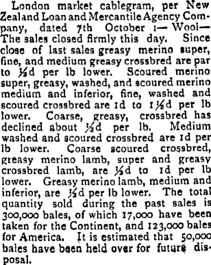 London market cablegram, per New Zealand Loan and Mercantile Agency Company, dated 7th October 1 — Wool — The sales closed firmly this day. Since close of last sales greasy merino super, fine, and medium greasy crossbred are par to }4d per lb lower. Scoured merino super, greasy, washed, and scoured merino medium and inferior, fine, washed and scoured crossbred are id to ij£d per lb lower. Coarse, greasy, crossbred has declined about Jid per lb. Medium washed and scoured crossbred are id per lb lower. Coarse scoured crossbred, greasy merino lamb, super and greasy crossbred lamb, are to id per lb lower. Greasy merino lamb, medium and inferior, are jid per lb lower. The total quantity sold during the past sales is 300,000 bales, of which 17,000 have been taken for the Continent, and 123,000 bales for America. It is estimated that 50,000 bales have been held over for future disposal.