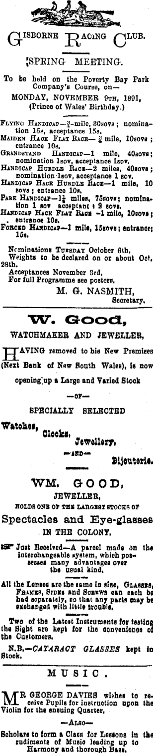 Q.ISBORNE ACING QLUB. [SPRING MEETING. To be held on the Poverty Bay Park Company's Course, on— MONDAY, NOVEMBER 9th, 1891, (Prince of Wales’ Birthday.) Flying Handicap—j-mile, SOsovs; nomination 15s, acceptance 15s. Maiden Hack Flat Back— J mile, lOsovs ; entrance 10s. Grandstand Handicap—l mile, 40aovs; nomination Isov, acceptance Isov. Handicap Hvbdlb Bags—2 miles, iOsove; nomination Isov, acceptance 1 sov. Handicap Hack Hurdle Back—l mile, 10 sovs; entrance 10s. Park Handicap—l| miles, 75sovs; nomination 1 sov acceptant i 3 sovs. Handicap Hack Flat Bag* -1 mile, lOsovs; . entrance 10a. Foncxn Handicap—l mile, ISsovs; entrance; 15s. Nominations Tuesday October 6th. Weights to be declared on or about Oct. 28th. Acceptances November 3rd. For full Programme see posters, M. G. NASMITH, Secretary. W. Good, WATOHMAKEB AND JEWELLER, I~~|~ AVING removed to his New Premises (Next Bank of Naw South Wales), is now opening up a Large and Varied Stock —OF—SPECIALLY SELECTED Watohei. ’ Oleoka, JeWleryi —AS»— SljoutarU. WM. GOOD, JEWELLER, HOLDS one of the LARGEST stocks of Spectacles and Eye-glasses IN THE COLONY. IS* Just Received—A parcel made on the interchangeable system, which possesses many advantages over the usual kind, All the Lenses are tbs same la sice, Glasses, Frames, Sides and Soaxws can each be had separately, co that any parts may be exchanged with little trouble, Two of the Latest Instruments for testing the Bight are kept for the convenience of the Customers. N.B, —CATARACT GLASSES kept in Stock. MUSIC. __ MR GEORGE DAVIES wishes to reoeive Pupils for instruction upon the Violin for the ensuing Quarter. —Also— Scholars to form a Class for Lessons in the rudiments of Music leading up to Harmony and thorough Bass.