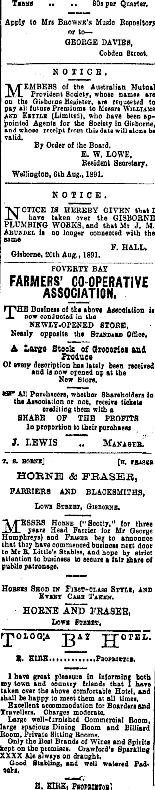Terms ~ .. 80s per Quarter, Apply to Mrs Browne’s Music Repository or to— GEORGE DAVIES, Cobden Street. NOTICE. MEMBERS of the Australian Mutual Provident Society, whose names are on the Gisborne Register, are requested to pay all future Premiums to Meters Williams and Kittle (Limited), who have been appointed Agents for the Society in Gisborne, and whose receipt from this date will alone be valid. By Order of the Board. E. W. LOWE, Resident Secretary. Wellington, 6th Aug., 1891. NOTICE. Notice is hereby given thati have taken over the GISBORNE PLUMBING WORKS, and that Mr J. M. Arundel is no longer connected with the same F. HALL. Gisborne, 20th Aug., 1891. POVERTY BAY FARMERS* COOPERATIVE ASSOCIATION. THE Business of the above Association is now conducted in the NEWLY-OPENED STORE, Nearly opposite the Btandabd Office. A Large Steels of Groceries and Produce Of every description has lately been received and is now opened up at the New Store. S* All Purchasers, whether Shareholders in the Association or not, receive tickets crediting them with a SHARE OF THE PROFITS In proportion to their purchases J. LEWIS Manages. T. S. HORNE] [H. FRASER HOENE & FRASER, FARRIERS AND BLACKSMITHS, Lows Stbeet, Gisborne. MESSRS Horne ("Scotty," for three years Head Farrier for Mr George Humphreys) and Fbaseb beg to announce that they have commenced business next door to Mr R. Little’s Stables, and hope by strict attention to business to secure a fair share of public patronage. Homes Shod in First-class Style, and Every Cabs Taken. HORNE AND FRASER, Lowe Street, fJVOLOGJA ~j:y OTEL~ E. KIRK. ..Pbofrietob. 1 have great pleasure in informing both my town and country friends that I have taken over the above comfortable Hotel, and shall be happy to meet them at all times. Excellent accommodation for Boarders and Travellers. Charges moderate. Large well-furnished Commercial Room, large spacious Dining Room and Billiard Boom, Private Bitting Booms. Only the Best Brands of Wines and Spirits kept on the premises. Crawford’s Sparkling XXXX Ale always on draught. Good Stabling, and well watered Pad* oat's. E, KIliK; PaoFkllTon]