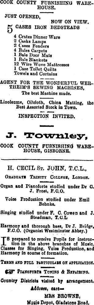 COOK COUNTY FURNISHING WAREHOUSE. JUST OPENED, NOW ON VIEW, g OASES IRON BEDSTEADS 4 Crates Dinner Ware 2 Casks Lamps 2 Cases Fenders 4 Bales Carpets 1 Bale Door Mats 1 Bale Blankets 12 Wire Wove Mattresses 1 Case Toilet Quilts Towels and Curtains AGENT FOR THE WONDERFUL WERTHEIM’S SEWING MACHINES, The best Machine made. Linoleums, Oilcloth, China Matting, the Best Assorted Stock in Town, INSPEOTION~INVITED. J- Townley, COOK COUNTY FURNISHING WAREHOUSE, GISBORNE, H. CECIL St. JOHN, T.C.L., Graduate Trinity College, London. Organ and Pianoforte studied under Dr 0. J. Frost, F. 0.0. Voice Production studied under Emil Behnke. Singing studied under F. 0. Cowen and J. Steadman, T.U.L Harmony and thorough base, Dr J. Bridge, F.C.O. (Organist Westminster Abbey.) IS prepared to receive Pupils for instruction in the above branches of Music. Classes for Singing, Voice Production, and Harmony in course of formation. Terms and full farticulibs on affmoation. O” PtANOFOBTi Tuning & Repairing. Country Districts visited by arrangement, Address, care— MBH BROWNE, Mtw Depot, Gladstone Bead.