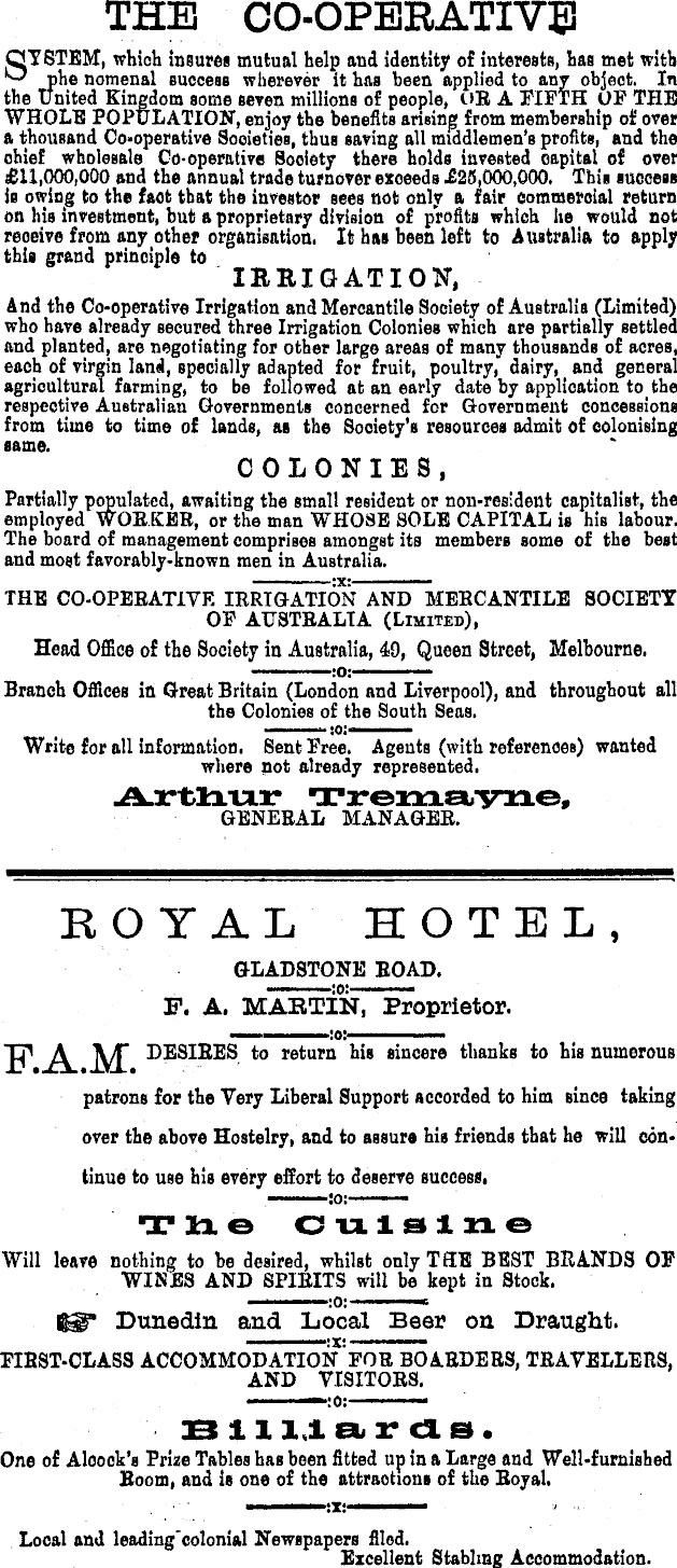 THE CO-OPBRATIVB QY STEM, which insures mutual help and identity o£ interests, has met with phenomenal success wherever it has been applied to any object. In the United Kingdom some seven millions of people, DR A FIFTH OF THE WHOLE POPULATION, enjoy the benefits arising from membership of over a thousand Co-operative Societies, thus saving all middlemen’s profits, and the chief wholesale Co-operative Society there holds invested capital of over ' i 11,000,000 and the annual trade turnover exceeds £25, 000,000. This success I is owing to the fact that the investor sees not only a fair commercial return on his investment, but a proprietary division of profits which he would not receive from any other organisation. It has been left to Australia to apply this grand principle to IRRIGATION, And the Co-operative Irrigation and Mercantile Society of Australia (Limited) who have already secured three Irrigation Colonies which are partially settled and planted, are negotiating for other large areas of many thousands of acres, each of virgin land, specially adapted for fruit, poultry,' dairy, and general agricultural farming, io be followed at an early date by application to. the respective Australian Governments concerned for Government concessions from time to time of lands, as the Society’s resources admit of colonising same. COLONIES, Partially populated, awaiting the small resident or non-resident capitalist, the employed WORKER, or the man WHOSE SOLE CAPITAL is his labour. The board of management comprises amongst its members some of the best and most favorably-known men in Australia. THE CO-OPERATIVE IRRIGATION AND MERCANTILE SOCIETY OF AUSTRALIA (Limited), Head Office of the Society in Australia, 49, Queen Street, Melbourne. —:o—- : Offices in Great Britain (London and Liverpool), and throughout all the Colonies of the South Seas. so:— Write for all information. Sent Free. Agents (with references) wanted where not already represented. Arthur Tremayne, GENERAL MANAGER. ROYAL HOTEL, GLADSTONE ROAD. F. A, MARTIN, Proprietor. :o: — i ■■■ F.A.M. DESIRES to return his sincere thanks to his numerous patrons for the Very Liberal Support accorded to him since taking over the above Hostelry, and to assure his friends that he will continue to use his every effort to deserve success, :o: The cuisine Will leave nothing to be desired, whilst only THE BEST BRANDS OF WINES AND SPIRITS will be kept in Stock. —————:o: ———« Dunedin and Local Beer on Draught. FIRST-CLASS ACCOMMODATION FOR BOARDERS, TRAVELLERS, AND VISITORS. — :o; Billiards. One of Aloock’s Prize Tables has been fitted up in a Large and Well-furnished Room, and is one of the attractions of the Royal. Local and leading"colonial Newspapers filed. Excellent Stabling Accommodation.