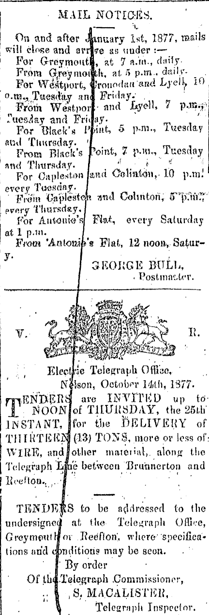 • MAIL NOTIC-ltS. On and after J inuary Ist, 1877, mails will close and orr ?e as tinder : — For G-reymout , at 7 a.'ru-, daily From G/eymo-i 1 ' bit, at "•> p.m.. daily- _ . For WMtyovt, Jrotiodisti 'and Lyell, 10 o.ra., Tuesday am Friday.' , From Westpor ■ and lyell, 7 p..is^ Tuesday and Fri( ay. ' ' For 'Black's I J rittt, 5 p.m M Twsday and Tluireday. ' m . From Black's 'oint, 7 r.-™". .Tuesday and Thursday. , ' ! , ' ,1 ; For Oiipleston ann Oolmton,. 10 p.m: ' ever? Tuessfly. Fi-otn ■Qaplestcp ?ind Gountori, ff" y p.'rii.7 pvnry Thursday. I For A»t/O«i<j's| Fl»i, every Saturday at 1 p.m. / From •AatosMps Flat, 12 nooiv, Satury * I 3KOIJGE BULL, j . . Postinnttcr. [ \ Electpe Telegrajih Ofli'ae, NJHson, October 14th, 1377. TEJfOfeßil are INVrTtiD up toTIIUifSDAX the 25th' INSTANT.Jfop the DELIVERY of TIIIKTEKSJ (13) TONS, more or less of: WIRE, andlolher material,, along tlie Telegraph Lpe between Urutinerton and j Uoel'tOD.. .1 TENDERS to be addressed to the undersigned at the Telegraph Ofll'.-e, Greymp^itf m I?edflon', where- 1 specifications «nd < mditiotis may be scon. ' By order • \ Of th< Telegraph .Comraissionpr, \. ,S. MA.CALISTISH,. Telegraph Inspector.