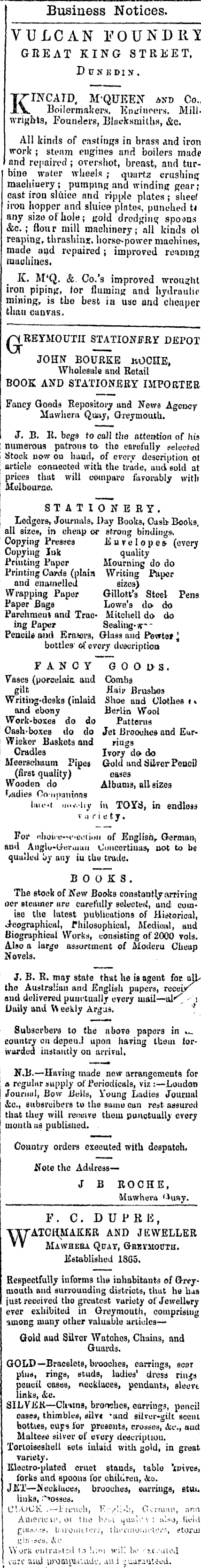 Business Notices. VULCAN FOUNDRY GREAT KING STREET, KINCAID, M'QUEEN asd Co., Boilermakers. Engineers. Millwrights, Founders, Blacksmiths, &c. All kinds of castings in brass and iron work ; steam engines and boilers made and repaired ; overshot, breast, and turbine water wheels ; quartz crushing machiuery; pumping and winding gear; cast iron sluice and ripple plates; sheef iron hopper and sluice plntes, punched t< any size of hole; gold dredging spoons &c. ; flour mill machinery; all kinds ol reaping, thrashing, horse-power machines, made and repaired ; improved reaoing machines. K. M'Q. &. Co.'s improved wrought iron piping, lor fluming and hydraulie mining, is the best in use and cheaper than canvas. r. REYMOUTH STATIONERY DEPOT JOHN BOURKE nOCHE, Wholesale and Retail BOOK AND STATIONERY IMPORTER Fancy Goods Repository and News Agency Mawhera Quuy, Greymouth. J. B. R. begs to call tho attention of his I numerous patrons to the carefully selected Stock now on baud, of every description ot article connected with the trade, and sold at prices that will compare favorably with Melbourne. STATIONE RY. Ledgers, Journalsy Day Books, Casb Books, all sizes, in cheap or strong bindings. Copying Presses Eurelopes- (every Copying Ink quality Printing Paper Mourning do do Printing Cards (plaia Writing Paper and enamelled sizes) Wrapping Paper Gillot^s Steel Pens Paper Bags Lowe's do- do Parchment and Trac- Mitchell do do ing Paper Sealing- syPencilft and Erasers, Glass and Pewte* !, bottles' of every description FANCY GOODS. Vases (porceloic and Combs gilt Hai? Brushes Writing-desks (inlaid Shoe and Clothes 1 1 and ebony Berlin Wool Work-boxes do do Patterns Cash-boxes do do Jet Brooches and EurWicker Baskets and riugs Cradles Ivory do do Meerschaum Pipes Gold and Silver Peucil (first quality) oases Wooden do Albums, all sizes ladies Co'npaiiions hiu-i u..»vliy in TOYS, in endless variety. For nhoire— (■•cciiiMi of English, German, and Anglo-Ger.uau Concertinas, uot to be quailed by auy iu the trade. BOOKS. The stook of New Books constantly arriving oer steamer are carefully selected, and comise the latest publications of Historical, Geographical, Philosophical, Medioal, aud Biographical Works, consisting of 2000 vols. Also a large assortment of Modern Cheap Novels. J. B. R. may state that lie is agent foe alltho Australian and English papers, recety^ and delivered punctually every mail — al»^ - ! Daily and VN eekly Argus. _ Subscrbers to the above papers in >^ couutry en depeuJ upon having them forwarded instantly on arrival. N.B. — Having made new arrangements for a regular supply of Periodicals, viz : — Loudon Journal, Bow Jiells, Young Ladies Journal &c, subsreibers tu the same can rest assured that they will receive them punctually every month as publisned. Country orders executed with despatoh. Note the Address — J B ROCHE, Mawhera '-"Miay. ! F . C . DUPBG, TTTATCHMAKKR AND JEWELLER * » Mawheba Qiur, Gbevmoitth. Established 1565. Respectfully informs the inhabitants of Greymouth and surrounding distriots, that he has just received the greatest variety of Jewellery ever exhibited in Greymouth, comprising among many other valuable articles — Gold aud Silver Watches, Cliaim, and Guards. GOLD —Bracelets, brooches, earrings, scor pins, rings, Btuds, ladies' dress riu^s peucil cases, necklaces, pendants, sleeve links, &c. SILVER — Chains, broaches, earrings, pencil oases, thimbles, silv« -and silver-gilt seent botties, cups ior presents, crosses, &,v., aad Maltese silver of every deacriptiou. Tortoiseshell sets inlaid with gold, in great variety. Electro-plated cruet stauds, table 'inives, forks and spoons for childreu, &o. JET — Necklaces, brooches, earrings, etut. links, .bosses. CLUCK -— 'French, F:\-'',i-.l:, o..nu:ui, ar.n AaiOl'lc.U', 01 Oil} lv;.i 4iuw;"v : :ws-j, iiekl gUlo:'.::", Dti'Oint.U.'i-;, thcnilOlilcl'.'i':", I'tOi'Ul s;i:i:s«;s, Ac. Wurli entrusted Li !r.m will W '-;.c.-uU\] aire aad in'oaipuuid.:, Mi -^uarautocd.