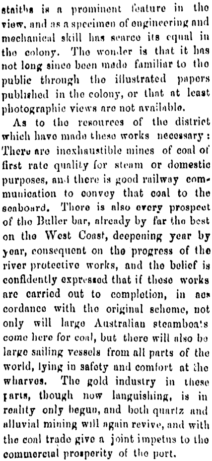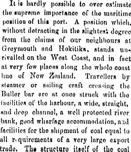 It is hardly possible) to ovor os'.imato tho iuprimio importanoe of tho maritime position of tliii port. A position whioh, I without detracting in tho slightest do^rce from tho chums of our neighbours nt, Groymouth nnd Hokitika, stands un* rivollod on tho Wost Const, and in fnct nt rory fow plnoos along tho wholo const lino of Now 2Sdiiland. Trnvollors by stontnej! or sailing crnft crcs^nj; tho Bailor bar nro at onoo strtiok with tho I'uoililios of tho harbour, n wide, struiijht, nnd tleop ohnnnol, a well protootod rivor hank, good whnrfngo noooniinodation, nad fnciliiios for tho shipmont of coal equal to all r<quiroments of a very largo export trudo. Th« etructuro itsolf of tho coal