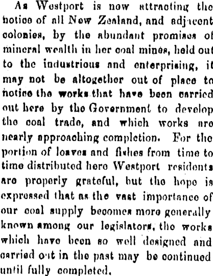 As Wostport is now Httraotinu; tho hotioo of nil Now Zanland, and adjicont colonies, by tho abundant promises of mineral wraith in lior coal minOe, bald out to (he industrious nnd enterprising, it may not be altogether out of place to notice (he works tliat ha«e been carried out bore by tho Government to develop tho oonl trado, and which works nro nearly npproaohing completion. For tho portion of loaroi and finlios from time to timo distributed hero VVestporl rrßidont» ,«ro properly Rratoful, hut tho hopo is exprosscd that n« the va»t importnnco of our coal supply booomes moro Ronemlly known amon« our le«islntor«i, tlio works which hnyo bcon bo well 'designed nnd oarried oit in tho pnst may be oontinued until fully ootnpletcd.