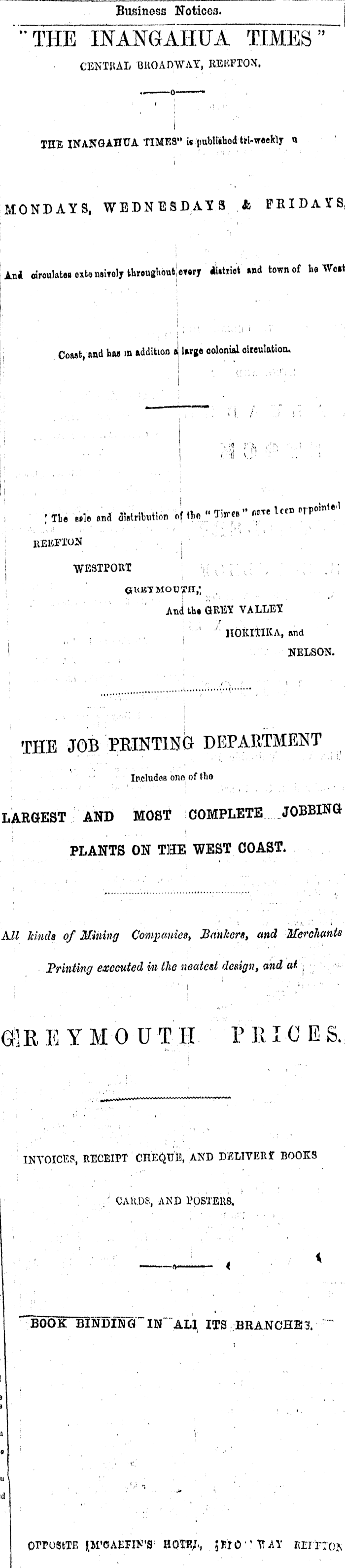 Business Notices. "THE INANGAHUA TIMES" CENTRAL BROADWAY, REKFTOM. i THi: INANQAHUA TIMKS" i« tmbliiHod W-xraekly n i MONDAYS, WEDNESDAYS & FRIDAYS, An* «roulat M cxt O nßitolythreuga6ut|of 9 ry aiitnot wd town of he Welt ; j ■ j Coa»t, and hoe m addition «j lwge colonial circulation. . . ■ . ■ ■ ;■ . :.' *1. /' J S. I : ■• ■ ' , 1 • 1 ..•■■■■■■■••■■ _. fl i ... | ', ; tic Bale and of ft.; Ttof. " «tt Uc« TP^^ I '' ! WESTPOUX : ; }( ,:J" .; ' , ' • ; .! \ . ai<KT MOUTH,' Atxi th« GREY VALIjEY ... ■ • . ■/■ ; ' '■ HOiailKA, and i '■!■••.•.■■' I NELSON. - - ■'"' ■■■■.■• ''■':' ■■•: /;\..;... ■■■■<?■ ;■— .. , i THE JOB PRINTING DEPARTMENT ! Xncludcß onoof tbo LARGEST AND MOS* COMPLETE .JOBBING PLANTS ON THE WEST COAST. All kinds of Mining Companies, Bankers, and Merchants Printing executed in the neatest design, and at ■• GIREYMOUTH P RICES. i INVOICES, RECEIPT CHEQUJB, AND DELIVER t BOOKS , ,. J QAU.DS, AND I^BTBttS. ' ' . . ..- i 4 : ■ ■' -. , «>_- i ■ ■■' * BINDING" IN' ALI, ITS BRANOHB3. " : . .■...■,. : . V - '■' ■ ■ v ' ;i "' ■' :* \ •"