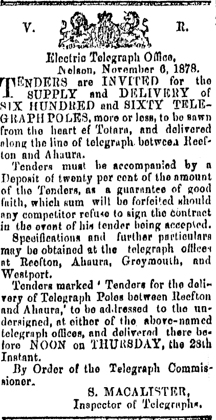 Electric Tole^raph Oftloo, kelson, Norember 0, 1878. npRNDERS are INVITEO for tho 1. SUPPLY and DRLIVBUY of SIX HUNDRED and SIXTY TKLEGUAPH POLES, more or lean, to bo snwn from tho heart ef Totara, and delivorod nloni? tho lino of telegraph, botwcea ReOflon and Ahuura. Tenders must be accompanied by a Deposit of twonty por cent of tho amount of tho Tonders, as a gunrnntee of Rood faith, which sum will be forfeited should any competitor rofmo to si^n tho fiontruct iv the event of hi* tender hoing accepted. Specifications and further poi'ticulnrs may bo obtained at tho telegraph ofllcei nt Reefton, Ahnura, Groymouth, and Wostport. , Tenders marked ' Tenders for the delivery of Tolo»»raj)h Polos botvroen Roefton and Ahnura,' to bo addressed to tho un* denuded, at either of the above-named telegraph offices, and delivered there bo* foro NOON on THURSDAY, the 28th Instant. By Order of tho Telegraph Commissioner. 8. MACA LISTER, Inspector of Telegraph*. Pi. ..1.,i I. l-.iiji iii^irlij'il P.MIHIU.m I' H I'l'.l.l.milM