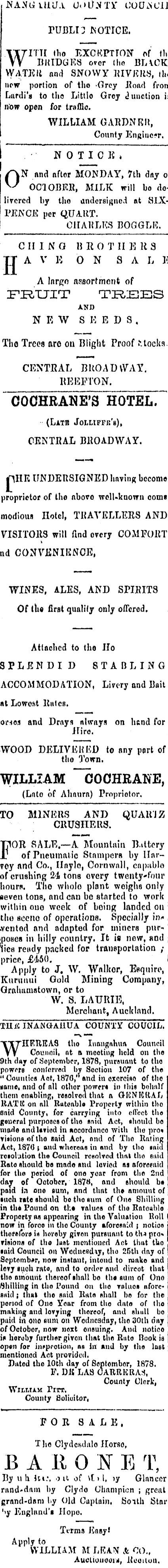 NA.VGVtIJ.I CMir.VTiT COUNCII PUBLH NOTICE. WITTI »ho EXCKPTION of (In BHIDGES over Iho BLICK VVATEU and SNOWY RIVKIW, th< now portion of tho -Grey Rond fron Lurdi'u to tho Littlo Grey Junction h now open for traffic. WILLIAM GARDNEIt, County Engineer. NOTI C E » 1 __ r\N and nftor MONDAY, 7th day ol OCIOBKR, MILK will bo dolivcrcd by tho andcrsigncd nt SIXPENCE per QUART. CHARLES BOGGLH. CIII N 0 BR O 'J' II ]3 R 3 TT A V K ON S A L E i A largo nsaortmenfc of FRUIT TREES AND NEWS K EDS, Tho Trees aro on Blight Proof Mocks. CENTRAL BROADWAY. KEEFTON. COGHRANE'S "HOTEL. (Latb Jolliffb'b), CENTRAL BROADWAY. nHE UNDERSIGNED having become proprietor of the nbovo welUknown comi modioua Hotel, TRAVELLERS AND VISITORS will find ovcry COMFORT nd CONVENIKNCE, WINES, ALES, AND SPIRITS Of tti« first qualify only offered. < Attached to the Ho SPLENDID BTABLING ACCOMMODATION, Livory and Bait at Lowest Kulcb. of -10,1 and Drays always on htnd for Hire. WOOD DELIVERED to any part of tho Town. WILLIAM ~COCHRANE, (Lnto of Ahaurn) Propriotor. TO MINERS AND QUAR'iZ CRUSHERS. FOR SALE.-— A Mountain B.ittcry of Pneumatic Stampers by llnrvoy nnd Co., Haylo, Cornwall, capablo of criißhing 24 tons overy twenty-four hours. Tho wholo plant weighs only fßeveu tons, and cau be started to work within ouo week of being landed on tho aceno of operations. Specially in* wentod and adapted for miners purposed in hilly country. It is new, and lies rewdy packed for transportation / price, £450. Apply to J. W. Walkor, Esquire, Kunmui Gold Mining Company, Grahamatown, or to W. S. LAURIE, Merchant, Auckland. THiC INANGAiIUA COUNTY COUCIL. WHEREAS tho Inangnhua Council Council, ot a mooting hold on tho 9th day of Soptomber, 1878, pursuant to tho powers oonforrod by Section 107 of the " Counties Act, 1870, and in oxorcioo of tho name, nnd of all othor power* in this bohnlf them enabling, resolved that a GICNICRAL 11ATIC on nil Rutenbla Property within tho snid County, for carrying into o licet the general purposes of tho unid Act, ohould bo made andltviod in accordnnco with the pro* viaionsoftho said Act, nnd of Tho Rut ing Act, 1870 i and whereas in and by tho ania resolution the Counoil resolved tlmt tho snid Rato should ba mndo and loviod as nforeeukl for tho period of ono year from tho 2nd day of Ootobcr, 1870, and should b» paid in ono sum, nnd that the amount of such rate should bo tho sum of Ouo Shilling in tho Pound on th« valuos of tho Ratoahlo Proporty as apponring in the Valuation Roll j now in foroo in tho County aforesaid j notion thorefor* in horoby given pursuant to th* pro* visions of tho lu»t mentioned Act that tUo said Council on Wednesday, tho 25th day of September, now instaut, intend to ruako and levy suoh rato, and to order and direct that tho nmbunt thereof shall bo th« sum of Ono Shilling in tho Pound on tho valuos afore fluid ; that tho fluid Rato shall bo for the period of Ono Yoar from tho ditto of tho making and lovying thereof, and eh nil bo paid in ono mini on Wednesday, tho 30th any of October, now next ensuing. And notico in horoby furtlior given that the Riito Hook is op«n for iii'protion, as in and by the lust mentionod Act provided. Dutod tbo 10th day of September, 1878. F. DM LAS CAIIRKRAS, County Clork, Wiixia.x Pitt, County Boliuitor, FOR SALE, Tho Clydcndiilo Horso, B A R 0 N E T, Uy uh in:, oit of \f. ».l, >y Glancor rand'dam by Clydo Champion ; great grand-dam by Old Captain. Boith Star ''y England's Hope. Terms Easyt Apply to WILLIAM M LEAN A 00., Aucliouoom, Kooiiou.