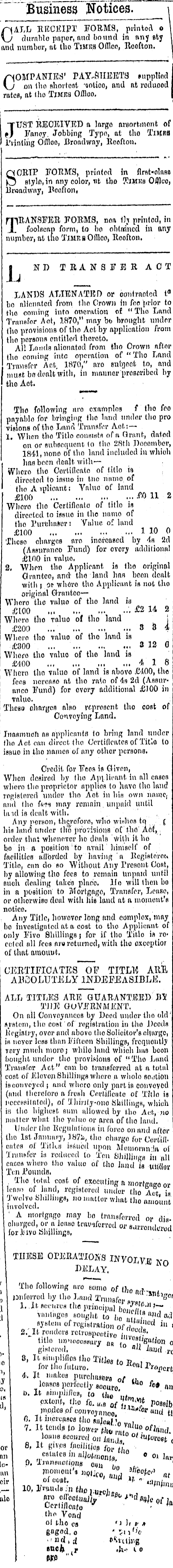"Business Notices. \ CALL RECEIPT FORMS), prJnlod o I durable paper, and bound in any ßfcy 1 and number, at tho TiMKg Office, Roofton. /COMPANIES' PAY,6inJKT3 nuppliod \j on iho flhorloat 'ootioo, and at rodupod rates, at tho Tjmjss Oilloo. TIJST RECEIVED a largo areortmont of fj Fancy. Jobbing Typo, at tho Ti*fßß JL'ijhting Offloo, Broadway, Rcefton. SCRIP FORMS, printed In first-clußß ei.ylo, in any color, lit tbo Wwkb O/flco, Uroadwuy, l*ooflon ( mRANSFER FORMS, noa 1)j printed, in ,JL foolscap form, to bo obtwincd in any nunibor, at tho TIMR ti Oflloo, Roofton. JND TRANSFER ACT J ; : LANDS ALIENATED or contracted l a bo alionatod from tbo Grown in foe prior to tho coming into ottcration of " Tho Land Transfer Aot, 1870," may bo brought under tho provisions of tho Act by application from tlio persona entitled thoroto. All Lnnds alionatod from tbo Crown after tbo coming into operation of " Tho Land Transfer Ant,, 1870," aro subject to, and must bir dealt with, in maunor proscribed by tho Aot. Tho following tiro cxamplos f tho feo payablo for bringing tbo bind undor tbo pro visions of tbo Land Transfer Aot: — 1. When tbo Title consist* of a Grant, dated on or subsequent <o tho 28th Dooombor, 1841, nono of tbo land included in which has boon doalt with— Whcro tho Cortiflcato of title if» ; dircotod to iauuo in tlio numo, of tho A iplicant i Value of lnnd £100 M 11 2 Wboro tlio Certificate of titlo in directed to issuo in the name of tho I'uruhasw s Vuluc of land £100 ... 1 10 0 Tlicbo oharges oro inoroaticd by 4b 2d (Assurance Fund) for ovory ndditionnl iCinO in value 2, When tbo Applicant is tho original Grantco, nnd' tho land baa boon dealt with j or whoro tho Applicant is not tho original Grantoo — Whoro tho vuluo of tho land is £1,00 ...". £2 14 2 Whoro tho valuo of tlio land ] | £200 ... ... 8 3 4 Wboro tho valuo of tho land ia £300 ... S 12 0 Whoro tho valuo of tho land is £100 4 18 Whoro tho valuo of land is abovo £400, the fees norenso at tho ralo of 4s 2d (Aaoui 1 " unco Fund) for ovory additional £)00 in valuo. ThcßO chai'yes alwo rtproacnt tho cost of Convoying Land. Inasmuch fls appliennts to bring land under (be Act can direct tho CcrtidcatOß of Titlo to issue in tho nainoo of any other persona. Credit for Foes ia Given, Whon desired by tlio Api Meant in all caßoo wbero tbo proprietor applies to }iavo Iho land vogJalnvod undov tho Aot in li'ih own name( and tho fats may remain , unpaid until laid is dealt with. . ' , Any person, therbforo, who witihos to { his land lUider iho provhibna of tlio' Aof, . order that whenever ho dnnla Vyitb it ho bo jn ft position to avail 'himself of facilities "iill'ordod by having a Rcgistoroh Titlo, enn do so Without Any Prosont Cost, by allowing tho foea to remain Unpaid until Btioh dealing tivkc'o place. Ho will then bo in a position to Mortgago, Transfer, Leaso, or othorwiso deal with hie land at a moment's notico. , Any Title, howovor long nnd complox, may bo investigated at; a coat to tho Applicant of only Fivo Shillings j for if tho Titlo is ro« cctcd all feos nro returned, with tho oxcoptior of that amouut. CERTIFICATES OF TITLM AIA ABSOLUTELY INDEFEASIBLE. ALL TITLES ARE GUARANTEED IM TJIE GoVJfBNMJttNT. On all Conveyances b^ Deed under tho old' AVfltom, the cost ' of rogmtration in tho Dcods Registry, ovor nnd abovo tbo Solicitor's ol(wgc, in never lees than Fiftcon fcibillinga, frcquontly very xnucii moro; whilo land which bus boon bought undor tho provisions of "Tho Lund Transfer Act" cim bo transferred at a total coat of Elovoji Shillings where a wholo so<)tion is convoyed } nnd whoro only partis convoyed (nnd therefore a fresh Cortiilcato of Tftlo is licccsMlatod), of Thintyono SlaillingH, which is tho highest fium allowed by l,ho Act, no mutter what Iho valuo or area of tho land. I Under tho Regulations in ioreo on and after tho Ist January, Wk, tho elnirgo for Cdrl'i/lcntes of Titlui iski'cd upon Aieniornnla oi Transfer ia reduced to Ton Shijljiiga in ft H ensofl whuvo tho value of tho Jund is uhdor Ten .Poundfl. Tho total cost of owjentinffftttiorteogoor lciwo of land, registered under |.h 0 Act, is 'J wolvo Shillings, no matlor what tho amount involved. 1 A mortgago may bo transferred or di M . ohurged, or a loano tmvtforrod or Barm Ut'rod for h lvo blijllings, uu THESE OPERATIONS INVOLVE v n DELAY. ' Tho following aro somo of Ifco nr7-.«z iDiiforrod by iko Land Trunsfoi. gC( ™«ingo 9 «onght to 1,0 if/ • a> , ld ac] Bystcm of registration o f 5^ *« i 2.:ifc renders retro»p Of)t i vo „„?.■• titlo iinMoooflwj n« /"""■J'gaHon a ginlorod, "'« iuu<| i-( 0, It Bitnpljfios tho TitJflß «■« n forthofuturo. *to E °»l P^ crt 4. Jt niaJcea pHrclmsbw of n louses poribctlj- soouro A * «n b. It Bin.pliilcs, t 0 ti , ' cxtenf, IJwft.-.aSfJ^ poseib WPfloß pi: conveyance. " iOe "ml ti 0. It incicasea tho giijofll» n „„, 7. It .tends to Wvlf'.JJJjiaflind. 8, It gives /Aoililioß forth c ß tu(cßi«u^ t ,noni t/l ° ° Ol W 0. 'iinnßiiofions oi>n > 10, Frauds in th Dmo u BB , ' U Certi/lcafo - '■ tho Vonql ol tho cs ' J )( » » ' ntltd fitting