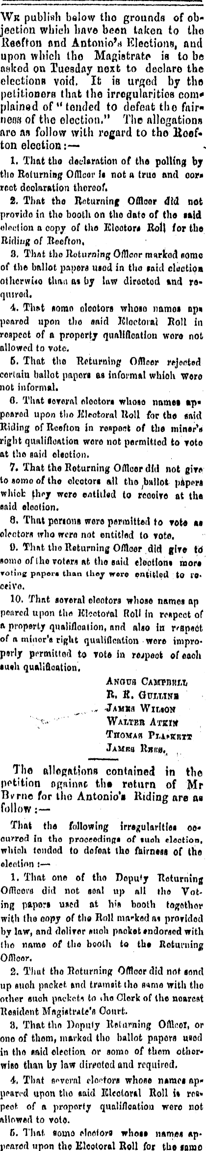 Wk publish below tho grounds of objection which have been taken to tho lleeffon find Antonio*.* Elections, and upon which tho Magistrate is to be aalced on Tuesday next to declare the electionn void. Ifc is urged by the petitioners that the irregularities com* plained of "tended to defeat t lie fair* ncos of the election." The allegations are an follow with regard to the Hoof* ton election :— 1. That tho declaration of tho polling by tho Rolurning Ofllcor is not a true and oor* root declaration thoroof. 2. That tho Returning Offloor 4t& not prorido in tho booth on the dnto of tho said oWtion aoopy of tho Elector* Roll /or the Ridiug of Hoe ft on, 8. TliAt tho Returning OfDcnr ranrkod nome of the bftllot paper*) usod in tho laid cluction ; othcrwido thna at by law dirootod tnd r»qiurod. \, Thnt sorao olootoru whoso namos ap« poarod upon the anid ICloctoial 801 lin roopect of a property qualification woro not allowed to vote. 6. That tho Returning Officer rejected certain ballot papers as informal whioh woro not informal. 0. That sororal alootors whoso names «p« ponrod upon tho Kleotoral Itoll for tho said Hiding of Roofton in respect of the miner** right qunlifloation wero not permittod to voto at tho said oleotion. 7. That the Roturning Offloor did not give to aomo of tho electors all tho ; b»llot papers whiofc fhry wero e/»titl«d to reooive at tha said eloolion. 8. That porions woro permitted to vot« as electors who wero not entitled to vote. 0. Thnt tho Returning Officer .614 giv© td «omo of the voter* nfc tho euid elootlon* more noting pnpara than ihoj were to *9> ceivo. 10. Thnt soreral clontora whoso names ap poarcd upon th« KlcotoCol Roll in rcupect of ft property qualification, and also in respect of n minor's right qualification were improperly permittod to vot* in rwpeok of each sa«h qualifloation. Anoub CAOTnufiti R. H. Gtrraira , Jamm Witiotf Waiter AtkW Thomas Pi.Af«nT* The Rllegations contained in the petition ogiiinnc th» return of Mr Bvmc for the Antonio'i Riding are aa follow : — That tha following irrsgutaritie* oo« oturocl in tho proceeding! of tuoh elaction, whioh tondod to defeat tho fairness of tho oleoti»n ! — ! 1. That one of tho Deputy Returning Ofllcoi'u did not seal up nil the Voting papers uncd at bin booth together with tha oony of tha Roll marked nt provided by law, and dolirer nuoh packet #ndor«od with (bo name of the booth to th« Roturuing Oflloor. 2. Tliuf tho Roturning Officer did not sond up Ruoh packet tnd tramsittho same with tho other suoh pneknfo to tha Clerk of the noarcat Resident Magistrate's Court. 8. That tho Dopufy Returning Offifiol, or ono of thorn, nuvkod tho ballot papers uaod in tho said election or aomo of them other* wifio than by law directed and required, 4. That fl"vcral rlootora whose numri ap« pparcd upon tho said EUotorkl Roll i» re«« peof. of a property qualification wero not allowed to voto. R. That, floino elneiors whose n»me« upjirared upon tho Elootoral 801 l for the fame