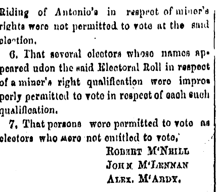 Biding of Antonio's in Mspi-ot of minor's richta were not permitted, to voto nt the fluid olction, 6. That sovorul olootoru whoso names np« pearcd udon the naid Klootorul Roll in raspoot ofanuncr'a right qnalificntion woro impro* porly permittoil to voto in respect of oaoh suah quftlifloation. 7, That persona woro permitted to voto ns eleotors who «oro not oniitled to voto/ ' EODHBT M'KHltit Jouk M'Lknkan Alkx. M'Ani>y,