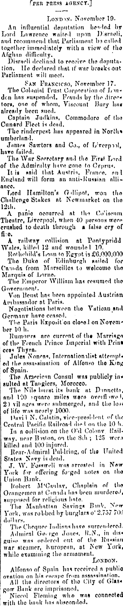 frj>n muss aor.vct.] LoNDtVf November 19. An influential deputation be'tdod by Lord Lnwronro waited upon Disrnoli, nnd recommend that Parliament bjcillod together immediately with a view of f ha Afghan difficulty. Pisrneli declined to receive the daputa{ion, Uo declared Mint if war bivjaks out Parlinmont will meet. f^AN Francicso, November 17. Tho Colonial Trust Corporation of Jim* den lins suspended. Frauds by tho director*, ono of whom, Viscount J3ury hns already been sued. Captain Judkins, Commodoro of t lie? Citnard Fleet is dead, Tho rinderpest has npponrod in North* umhorhind. Jnnioß vSavrtors and Co., of L : verp-nl, havo failed. Tho War Seerofcnry nnd the First Lord of tho Admiralty hum cono to C?pru«. It is said thnt Ausfrh, France, nnl England will form an nntMv'ussi.in nllinnce. Lord Hamilton's Odlipot, won tho Challenge Stakes nt Newnurkot on tho 12th. , A panio occurred At th-» (VUenm Theatre, Liverpool, when 40 parsons vrcrn crushed to death through a false cry of fie. A rnilwny collision nt Pontypridd Waled, killed 12 and woundnl 10. Hot build's Loan «o Egypt is £6,000,000 Tho Duke of Edinburgh nailed for Cnii<da from Marseilles t.) welcome tho Marquis of Lorno. Tho Kmporor William ha* resumed tho Government. Von Ueust hns boen appointed Austrian Ambassador nt Paris. Negotiations between tho Vatican and Gernvinv hnvo ceased. The Paris Kxpoait'on clo»o.l on November 10 h. Ihimovrs nro current of the Marriagi of the French Prince Imperial with Print ccs* Tliym, Jules Nonen*, Tntcrnatiomlist attempted t lit* nssassination of Alfonso tho Km£ of Spain. The AneriMn Consul was publicly in* suited nt Tangiers, Morocco. Til" NiU burst its bunk at Pinneltn, nnd I'ZO miles wer« ovovfi»wo», 2) vil ni^es writ fiiibmergod, nnd tlio \om of lifo w:»s nenrly 1000. Ihivi I N. Calntin, vire-prosi'lfnl of Uio Cenlrul Pneifirt Uftilroft'l <ln» I on tUo 10 h. In n ool!i«ion on tho O ! d Colony. Unil. wny. uenr IVwlon, on the Sih ; 125 wcr.» killed und 100 injured. Ilonr- Admiral Pullving, of tho VnWcd States Nnvy is dead. J. W. Fof«\T«'H n-Dfl nrrosted in Krtw Y»rk f>r offering fo'god notes on tho Union Uiink. Uoherfc Al'dulav, Chnplain of tho Oraniiemen nt Cmida Itns bren murderoi'i mippoppd for religious hnto. Tho Mhiiliattan Savings BmV, N r o»r I'ork, whs robbed by burglars o' 2,75? 700 dollars The Chequer Indians have surrendered. Admiral Grt^rgo Jones. U.N., in dis« jjuis« was ordered out of the .Rmsian war steamer, Kuropenn, nt ISevr York, while, examining tho armament. London. Alfonso of Spain hns received a public ovnliou on Ills escape fruni nssassinntion. All tho diri'utors of tho City of Gl*s« gotr I3j«jil- nro imprisoned, Niecol Fleming who was connected with tho bank hns abseondod.
