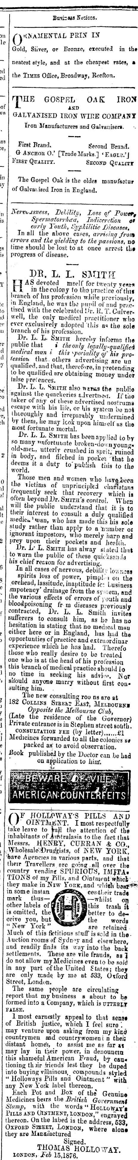 I Busirws Nonces. /^KNaMEBTTAL PRIN IS Gold, Silver, or Bronze, executed in th» neatest style, and at tho cheapest rates, a the Times Office, Broadwaj, Reefton. THE GOSPEL OAK IRON SALYAIfISED IKON WIRE COMPANY Iron Manufacturers and Galraniseri. First Brand. Second Brand. GAnchobO.' [Trade Marks.] <Ea<jlb.'J Fibst Qitazity. Second Qciirrr The Gospel Oak is the oldea manufactur of Galvai.ieed Iron in England. Nervousness, Deliliti/, Loss of Power, Spermatorrhoea, Indiscretion ot early Youth, Syphilitic Diseases, In all the above cases, awising from errors and the yielding to the passions, no time should be lost to at once arrest th« progress of disease. I)E. L. L. SMITH HAS devoted aself for tn-enty vents in the colony to tho practice of ting branch of his profession while previously, in England, he was tho pupil of and pr;<c- , tised with the celebrated I>r. H. T. Culreri well, the only medical practitioner who • ever exclusively adopted this a<* the sole branch of his profession. Dr. L. L. Smith hereby informs the ■ public that * the only legally qualified medical man i this speciality of his pro- •■ fession that others advertising are un qualified, and that, therefore, in pretending to be qualified are obtaining money under false presences. Dr. L. L. Smith also wawis the publio j against the quackeries advertise. Iftiie taker of any o » these advertised nostrums 1 escape with his lire, or his system bo not . t horoughly and irreparably " undermined k by them, he may look upon himself as the most lortunate mortal. Dr. L. L. Smith has been applied to br so many "nfortuiKite broken-dow K youn*. oldsmeL, utterly crushed in sprit/ruined 2 in body, and filched in pocket that he deems it a duty to' publish this to the world. Those men and women who havej>een > he victims of unprincipled charfatans ;, frequently seek that recovery which is often beyond l)r. Smith's control. When ! will the public understand that it is to t their interest to consult a duly qualified „ medic ' man, who has made this his sole study rather than apply to a -Dumber or ignorant impostors, who merely ham and I prey upon their pockets and health. Dr. LL. Smith has alway stated Ibn* to warn the public of these quicksands his chief reason for advertising. 3 In all cases of nervous, debilif r low nssa spirits loss of power, pimpl iO u the - orehead, lassitude, inaptitude fr business /mpotency' drainage from the sr-tem. and 3 the various effects of errors of youth and bloodpoisoning fr m diseases previously r contracted, Dr. L. L. Smith invites sufferers to consult him, as he lias no hesitation in stating that ho medical niau P either here or in England, has h;id the 3 opportuniies of practice and extraordinar experience which he has had. Therefo those who really desire to be treated one who is at the head of his profession s this branch of medical practice should Io 1 no time in seeking his advk'«\ JS 7 Q r '> slfould anyone marry without first consulting him. y ,„-, V* c new consult J n g roo ns are at * 182 Coiliks SiBKhT Eas*. Melboubsj Opposite ihe Melbourne Club, g (Late the residence of the Governor) j I nvate entrance is in Stephen street south . ■> Con sultatiojt fee (by letter),.... £l I Medicines forwarded to all the colonies g« c packed as' to avoid obserration. . -Book publishei by the Doctor can Jje had 8 ' on application to him". F FOLLOW AY'S PILLS AiSD OIKTIuiKT. I most respectfully take leave to la.}\ the attention of the inhabitants of irfstralasia to the fact that [ Messrs. HESBY, CUERAN & CO., , t ho]esate"i)ru.?j[i3ts, of NEW TORK, ' hare Agencies m various parts, and that their Travellers are going all over the i country vending SPUEIOITS, IMJTA. TTONS of my Tills, and Omfmerit *ftici they make inNiw FoEK,and T?!)clh'b3^^ in some inßtaa ces-their trade mark thus— MM- -B%— whilst on other labels of Bllrf|Mthis trash it is omitted, tlierJT^J better to deceive you, but %5--J|y the words " New York " ÜBB^ are retained Much of tbis fictitious sfnff is sold in theAuction rooms of Sydney and elsewhere, and readily fin3s its way into the back settlements. These are vile frauds, as I do not allow my Medicines even to be sold in any part of the United States; they are only mad^ by me at 533, Oxford Street, London. The same people are circulating report that my business a about to be formed into a Company, which is xrrrEßtir FAISE. 1 most earnestly appeal to that sens* of British justice, which I feel sure '. may venture upon asking from my kicd countrymen and countrywomen i n thei; distant home's, to assist me as far if may lay in taeir power, in denounein this shameful American F'"aud, by cau« tioning th >ir Mends lest they be duped into buying villainous, compounds styled " Holloways Pills and Ointment " with any New York label thereon. Each Pot and Box of the Genuine Medicines beirs the British Government Stamp, -niik the words " Hollo^At'i Pills and Ointment, London," engraved thereon. On the labed is the address, 633 Oxfobd Stbeet, London, where alont they are Hanafactured Signed. THOMAS HOLLOWAY. iondos, JFeb 15,1876.
