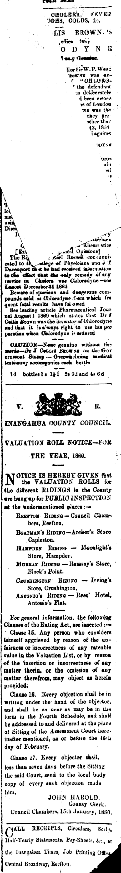 nwa wan 7G-HS, COLO3, Sc. LIS BROWN. 'S ,«diea **»» 'O D T N K {lorSirW.V.W«9i tdWHTB was «n---f "CHLORO- ' tlie defendafflt as deliberately • d beea bwoih* i« of Laados , •*s was t*W.-- T " iktsjr pre«therth;ir 12, 18.54 x»ro« aii» »(l '• DiseV \ .^tawba* C, -•-'Rhettit.atic* l&U. . ,^.-«tC4 Opiwons] Theßi^ -rjJTael BiHs^fi *oU'iuutM« eated to t&^^«dege «f Phj«oians ana i P Dareaport <•)* »c had r«o«¥€d iaferuiatioa to«4e dbot iimt Ac *aly rem««y «f atif (crriee «a Cko4*ra wt CMor«(i joe — soe La*oet DMenberSl IS«4 Beware of sp»r»as a«d dasgeixMts compoondtaold aa Chloradyae f>«m whteh fn fatal retaUa have foi owed See leading article Pharmaceutical Jour oalAo^Ht] 1869 which states that Dr / CcUis Brown was the inventor ot Ohlorodjna aad that it is aVaya right to use his p« paratMa vkea Ckiorodjne is ordered CAXTEIOV—TS*ua genaina wiUifla* tfc* wmda—At I o*c.u« iJaosrss am tke Gor eraWNtt flteßip ~ Orerw^eliiKaK •tiioal testuaoaj aooowvaniet eaA bottle Id bottles Is Hi 2s9iand4»6d INANGAHUA OOUNTT COUNCIL. VALUATION aOLL NOTICE— FOR THE TEAB, 1880. - NOMCE IS HEREBr GIVEN tfeat the VALUATION BOLLS for (he different El DINGS is the County ere hing «p for PUBLIC INSPECTION at the »naemseatioßed ftaecs %— Bkeftoit Bintira— Council Chaot*bers, Eeefton. Boatxajt's Braijra— Areiet'a Store Capleston. HIMPDSK EIDIN» — M«O*tig«4'« Store, Hampden. McBRAr Bxddk} — Baasay'« Store, ' Black's Point. CuvsniSQTos Buiixo — Irrio^'s Store, Crashington. AsToaio'a Brws* — BeeV Hotel, Antonio's Flat. For general t nforaatios, the foH<»«iflf CUuses of the Bating Act, are iwerted :— Clause 15. Any person who considers himself aggrieved by reason of the onfairaesa or incorrectness of any rateable value in the Valuation List, or by reaioa of the Insertion or incorrectness of any matter therio* or the omission of «oy matter therafrooi, may object as herein provided. Clause 16. Every objection shall be in wriuui; under the hand of the objector, and shall be as near as may be in the form in the Fourth Schedule, aad shall be addressed to and delivered at the plactt ot Sitting of the Assessment Court hereinafter mentioned, oa or befoie the Is>h day of February. Clause i 7. Every objector shall, less tbau seven days before the Sitting the said Court, send to the local bady copy of every such objection made him, JOHN HAROLD, Couniy Clerk. Council Chambers, 15 ih January, 18S9. i^ALL BfiCJSieiS, Circulars, Scrl^ Half- Yearly Statements. Pay-Sheets, &>., at j the laangaUua Times, Job Printing Oft?a^fl Central Broadway, Beeftoa. _^^^H