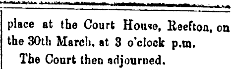 place at the Court House, Reeftoa, on the 30th March, at 3 o'clock p.m. The Court then adjourned.