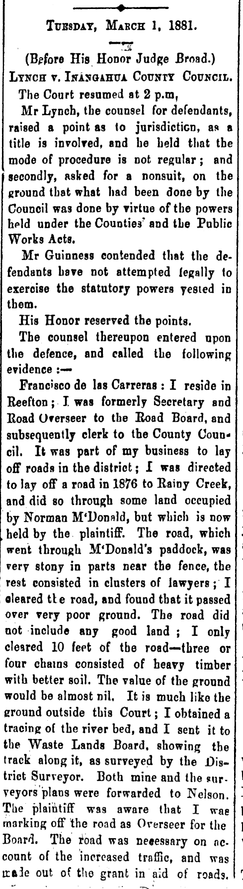 ♦ Tuesday, March 1, 1881. (Before His Honor Judge Broad.) Lynch v. Inangahua County Council. The Court resumed at 2 p.ra, Mr Lynch, the counsel for defendants, raised a point as to jurisdiction, as a title is involved, and be held that the mode of procedure is not regular ; and secondly, asked for a nonsuit, on the ground that what had been done by the Council was done by virtue of the powers hold under the Counties' and the Public Works Acts. Mr Guinness contended that the defendants have not attempted legally to exercise the statutory powers Tested in them. His Honor reserved the points. The counsel thereupon entered upon the defence, and called the following evidence :— Francisco de las Carreras : I reside in Reefton ; I was formerly Secretary and Road Overseer to the Road Board, and subsequently clerk to the County Council. It was part of my business to lay off roads in the district ; I was directed to lay off a road in 1876 to Rainy Creek, and did so through some land occupied by Norman M'Donald, but which is now held by the plaintiff. The road, which went through M'Donald's paddock, was very stony in parts near the fence, the rest consisted in clusters of lawyers ; I cleared tte road, and found that it passed over very poor ground. The road did not include any good land ; I only cleared 10 feft of the road— three or four chains consisted of heavy timber with better soil. The value of the ground would be almost nil. It is much like the ground outside this Court ; I obtained a tracing of the river bed, and I sent it to the Waste Lands Board, showing the track along it, as surveyed by the District Surveyor. Both mine and the suryeyors'plans were forwarded to Nelson. The plaintiff was aware that I wae marking off the road as Orerseer for the Board. The toad was necessary on nccount of the increased traffic, and was irft3e out of the grant in aid of roads.