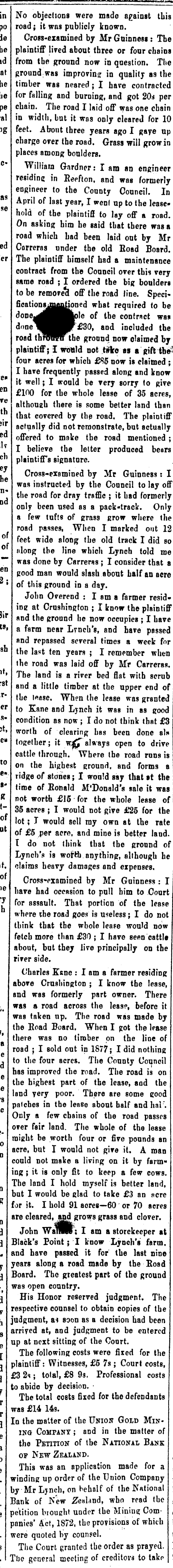 No objections were made against tbis road ; it was publicly known. Cross-examined by Mr Guinness : The plaintiff lived about three or four chains from the ground now in question. The ground wns improving in quality as the timber was neared ; I have contracted for falling and burning, and got 20s per chain. The road I laid off was one chain in width, but it was only cieareJ for 10 feet. About three years ago I gaye up charge over the road. Grass will grow in places among boulders. William Gardner : lam an engineer residing in Reefton, and was formerly engineer to the County Council. In April of last year, I went up to the leasehold of the plaintiff to lay off a road. On asking him he said that there was a road which had been laid out by Mr Correras under the old Road Board. The plaintiff himself had a maintenance contract from the Council over this very same road ; I ordered the big boulders to be removed off the road line. Sped* ficationsjj^tioned what required to be dooe^^^^Hple of the contract wan done^|^^HF £30, and included the road thfOTrrolbe ground now claimed by plaintiff; I would not tike as a gift too' four acres for which £85 now is claimed ; I have frequently passed along and know it well ; I would be very sorry (o give £100 for the whole lease of 33 acres, although there is some better land than that covered by the road. The plaintiff actually did not remonstrate, but actually offered to make the road mentioned ; I believe the letter produced bears plaintiff's signature. Cross-examined by Mr Guinness : I was instructed by the Council to lay off the road for dray traffic ; it had formerly only been used as a pack-track. Only a few tuffs of grass grow where the road passes, When I marked out 12 feet wide along the old track I did so along the line which Lynch told me was done by Carreras ; I consider that a good man would slash about half an acre of this ground in a day. John Overend : I am a farmer residing at Crushington ; I know the plaintiff and the ground he now occupies ; I have a farm near Lynch 's, and have passed and repassed several times a week for the last ten years ; I remember when the road was laid off by Mr Carreras. The land is a river bed flat with scrub and a little timber at the upper end of ! the l«ase. When the lease was granted to Kane and Lynch it was in as good condition as now ; I do not think that £3 worth of clearing has been done al* together; it w^' always open to drive cattle through. Where the road runs is on the highest ground, and forms a ridge of stones ; I would say that at the time of Ronald M'Don aid's sale it was not worth £15 for the whole lease of 35 acres ; I would not give £25 for the lot ; I would sell my own at the rate of £5 per acre, and mine is better land. T do not think that the ground oi Lynch's is woftb anything, although he claims heavy damages and expenses. Cross-examined by Mr Guinness : I have had occasion to pull him to Court for assault. That portion of the lease where the road goes is useless ; I do not think that the whole lease would now fetch more than £30 ; I have seen cattle about, but they live principally on the river side. Charles Ksne : I am a farmer residing above Crushington ; I know the lease, and was formerly part owner. There was a road across the leas?, before it was taken up. The road was made by the Road Board. When I got the lease there was no timber on the line of road ; I sold out in 1877; I did nothing to the four acres. The County Council has improved the road. The road is on the highest part of the lease, and the land yery poor. There are some good patches in the lease about half and hal". Only a few chains of the road passes over fair land. The whole of the lease might be worth four or five pounds an acre, but X would not give it. A man could not make a living on it by farm" ing ; it is only fit to keep a few cows. The land I hold myself is better land, but I would be glad to take £3 an acre for it. I hold 91 acres— 6o or 70 acres are cleared, and grows grass and clover. John Warnm: I am a storekeeper at Black's Point ; I know Lynch's farm, and have passed it for the last nine years along a road made by the Road Board. The greatest part of the ground was open country. His Honor reserved judgment. The respective counsel to obtain copies of the judgment, a* soon as a decision had been arriyed at, and judgment to be entered up at next sitting of the Court. The following costs were fixed for the plaintiff : Witnesses, £5 7s ; Court costs, £3 2s ; total, £8 9s. Professional costs to abide by decision. ■ The total costs fixed for the defendants was £14 14s. In the matter of the Union Gold Mining Company ; and in the matter of the Petition of the National Bank of New Zealand. This was an application made for a winding up order of the Union Company by Mr Ljnch, on behalf of the National Bank of New Zealand, who read the , petition brought under the Mining Companies' Act, 1872, the proyisions of which . were quoted by counsel, i The Court granted the order as prayed. , Tbe general meeting of creditors to take