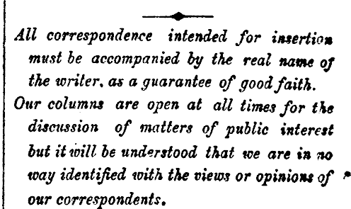 — ♦ All correspondence intended for insertion must be accompanied by the real name of the writer, as a guarantee of good faith. Our columns are open at all times for the dismission of matters of public interest but it will be understood that we are in no toay identified toith the views or opinions of * our correspondents.