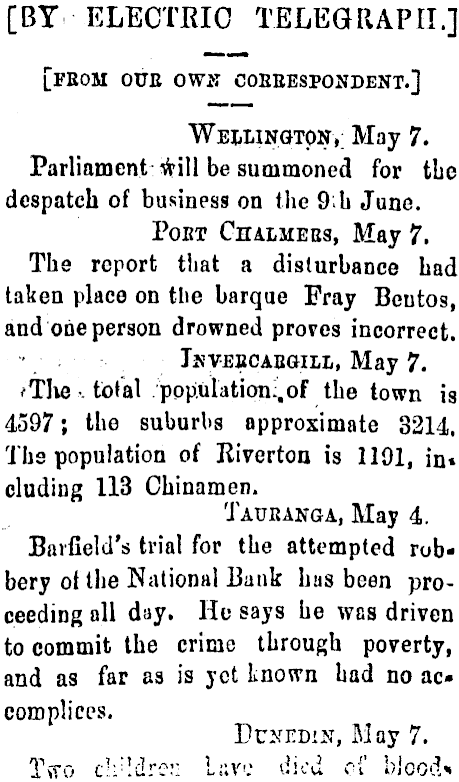 [BY ELECTRIC TELEGRAPH.] [fbom oub own coeeespondent.] Wellington,; May 7. Parliament -frill be summoned for the despatch of business on the 9>b June. Poet Chalmebs, May 7. The report that a disturbance had taken place on the barque Fray Beutos, and one person drowned proves incorrect. • Invebcabgill, May 7. ••The ... total population;, of the town is 4597 ; the suburbs approximate 3214, The population of Riverton is 1191, in* eluding 113 Chinamen. Taubanga, May 4. Baifield's trial for the attempted robbery ol the National Bank has been proceeding all day. He says he was driven to commit the crime through poverty, and as far as is yet known had no accomplices. Dunedin, May 7. I\to ch'ldren Lav-: died of blood*