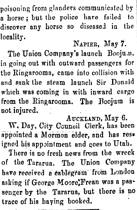 poisoning from glanders communicated by a horse ; but the police hare failed to discover any horse so diseased in the locality. Napieb, May 1. Tbe Union Company's launch Booju.n, in going out with outward passengers for the Ringarooma, came into collision with and sank the steam launch Sir Donald which was coming in with inward cargo from the Ringarooma. The Boojum is not. injured. . Auckland, May 6. W. Day, City Council Clerk, has been appointed a Mormon elder, and has ress igned his appointment and goes to Utah. There is no fresh news from the wreck of the Tararua. The Union Company have received a Cablegram from London asking if George Moore'Frean was a passenger by the Tararua, but there is no trace of his haying booked.